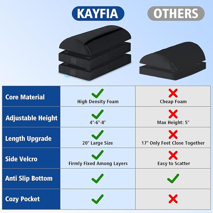 - [3 Adjustable Height] KAYFIA foot rest measures 20 "x11.8" x8 "with 3 adjustable height options from 4", 6 "to 8", which has velcro stickers on the lower and side for adjusting the height as needed. The upgraded length provides maximum freedom of movement for the legs to meet multiple usage postures.