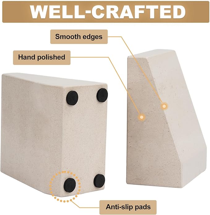 Koville Marble Bookends for Shelves, 9Lbs Large Bookends for Heavy Books, Non-Slip Heavy Duty Book Stopper for CD/Movies, Aesthetic Decorative Bookends for Shelves Table Home Decor(Beige)
