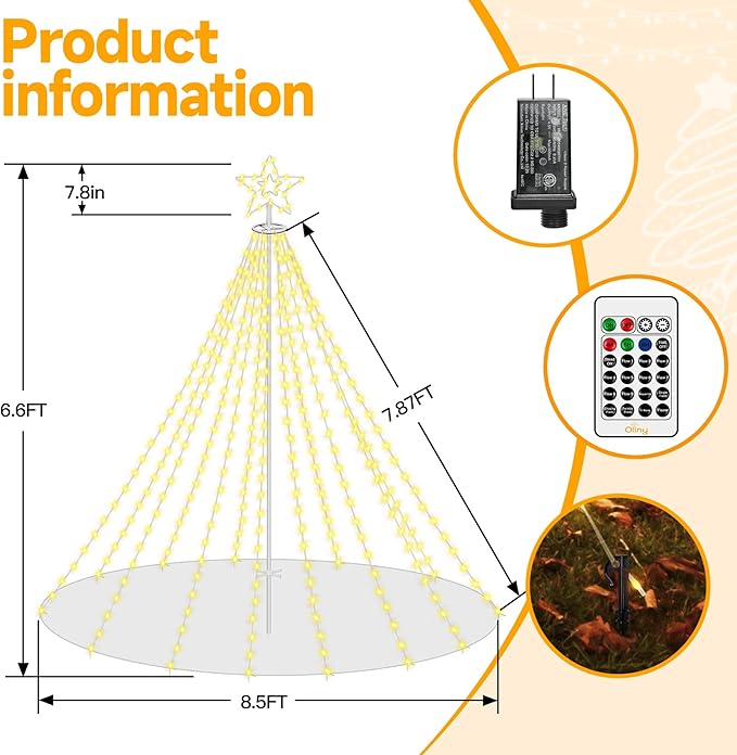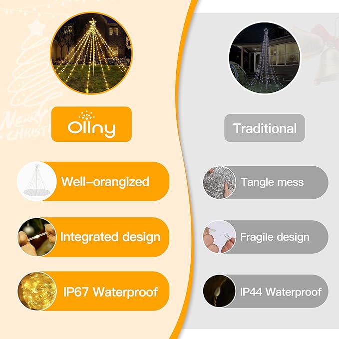 Ollny Christmas Lights Tree 340LED with Topper Star, IP67 Waterproof Remote Control Waterfall Lights with Pole, 16 Modes 3 Timers Dimmable Light Decorations for Outdoor Yard Garden Lawn(Warm White)