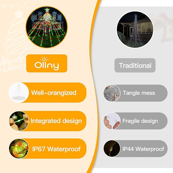 Ollny Christmas Lights Tree Red&Green 340LED with Topper Star, IP67 Waterproof Remote Control Waterfall Lights with Pole, 16 Lighting Modes Timer Dimmable Light Decorations Outdoor Yard Garden Lawn