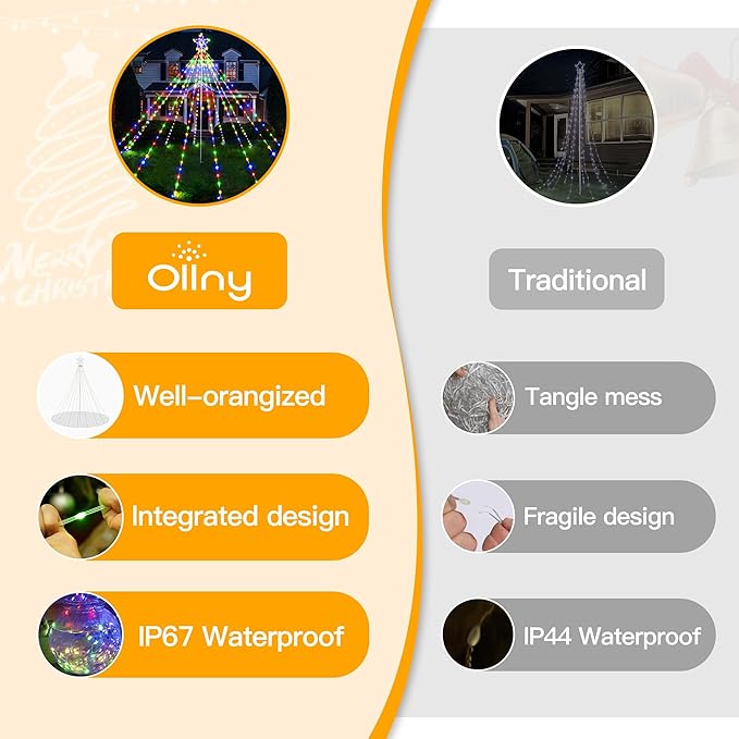 Ollny Christmas Lights Tree 340LED with Topper Star, IP67 Waterproof Remote Control Waterfall Lights with Pole, 16 Modes 3 Timers Dimmable Christmas Decorations Outdoor Yard Garden Lawn Multicolored