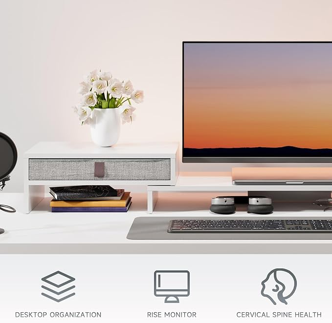 - 【Perfect Desktop Organizer】Our computer monitor riser includes 9.25 inches practicality slide-out drawers for storing items like post-it notes, writing utensils and mobile devices. The keyboard can be placed under the bracket, save more space on your desk.