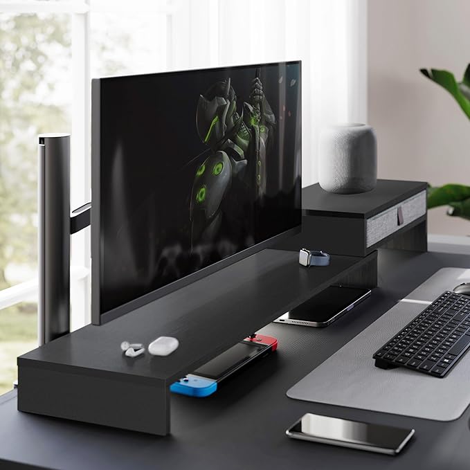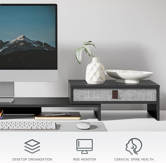 - 【Perfect Desktop Organizer】Our computer monitor riser includes 9.25 inches practicality slide-out drawers for storing items like post-it notes, writing utensils and mobile devices. The keyboard can be placed under the bracket, save more space on your desk.