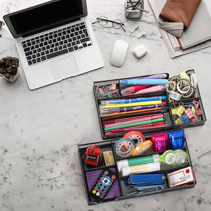 2 Pack Desk Drawer Organizer, Metal Mesh Drawer Office Tray, 6 Compartments Pen Organizer Storage Box, Desktop Basket Accessories for Home Office School Kitchen Vanity Supplies, Black