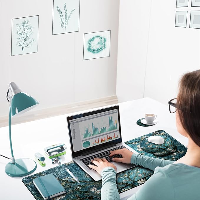 ARTSO Desk Mat, Large Gaming Mouse Pad Wrist Support Set, Ergonomic Keyboard Wrist Rest Desk Pad with Coaster Combo, Extended Mousepad with Non-Slip for Home Office, Blue Van Gogh Painting