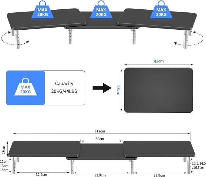 - 3 Height Adjustment - Raise computer monitor, notebook or any device by 110mm, 130mm or 150mm off the desk to create a comfortable viewing position and a healthier sitting position which help reduce stress on the neck and back. Simply press the button on the leg and lift/lower the platform to adjust between the different height levels.
