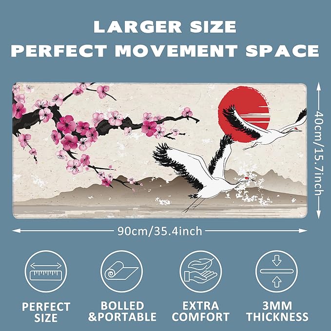 Extended Gaming Mouse Pad Sakura Branch and Flying Herons Large Mousepad with Stitched Edges,Anti-Slip Rubber Base Keyboard Mouse Mat Desk Pad for Gaming Home Office 35.4 x 15.7 inches