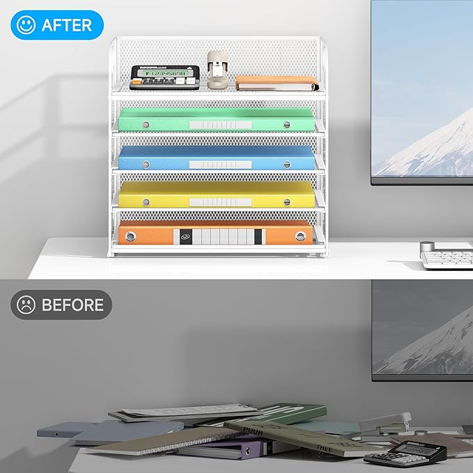Lavatino 5 Tray Paper Organizer Letter Tray with Handle - Mesh Desk File Organizer, Paper Sorter Organizer for Office, Home or School File Folder Holder - White