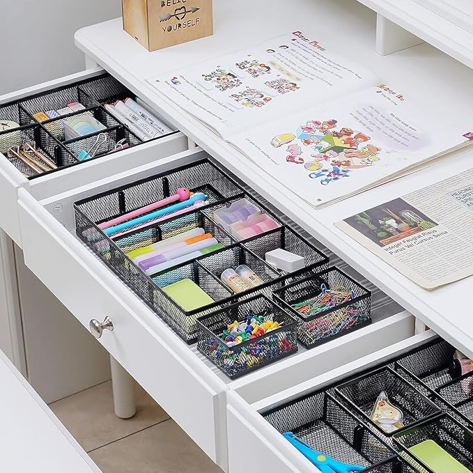 - 【Stury and Durable】Made of sturdy black wire mesh structure with powder coated surface, smooth and corrosion-resistant. Non-slip feet can keep the product stable.Big Drawer:12*8.3*2.2inches;2PC Small Drawers:3.5*3*1.9inches