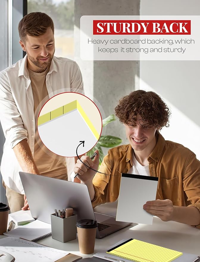 - [KEEP NOTES SECURE]: Each yellow writing pads 5x8 has black top bindings. The 5x8 notepad perforated top edge allows for easily and neatly removing individual sheets of paper. Yellow pad 5x8 has sturdy header and bindings keep the pages of your crucial notes protected, yellow lined paper pads won't fall apart under pressure like some lesser notepads. Legal pad features a cardboard backing for extra support when you writing or taking note, legal pad 5x8 perfect for writing on the go.