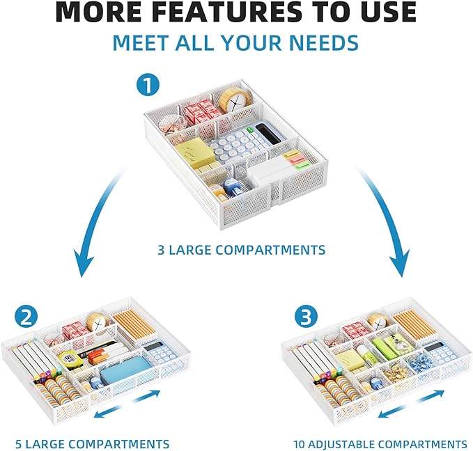 Marbrasse Expandable Desk Drawer Organizer, Mesh Drawer Organizer Tray with 10 Adjustable Compartments, Desk Organizers and Accessories, 5 Dividers Drawer for Office Supplies, Makeup & Vanity (White)