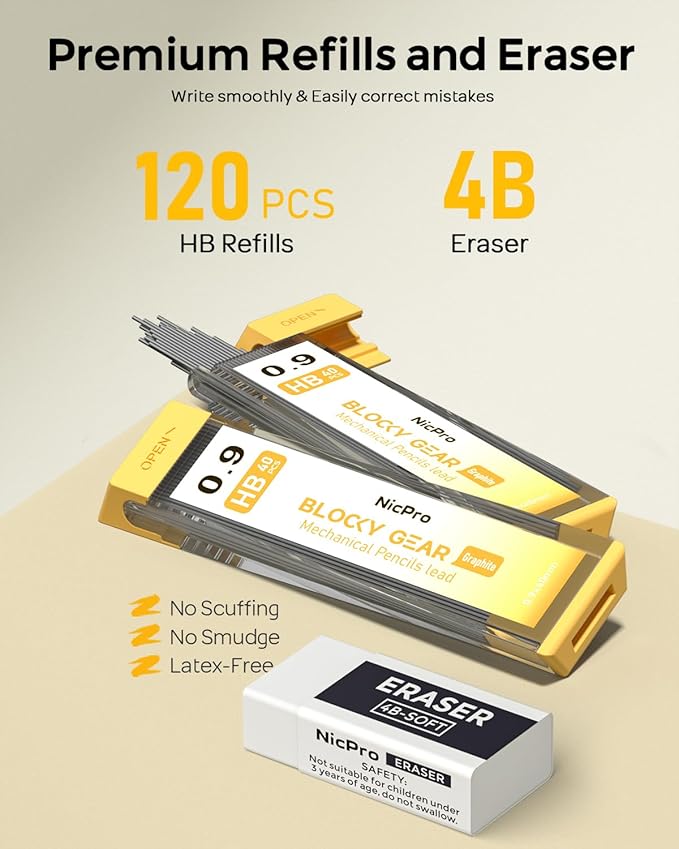 - Nicpro Blocky Gear:Come with a metal 0.9 mm mechanical pencil and 2 tube of 0.9 mm HB lead refills,40pcs / tube,1pcs 4B latex-free eraser,9pcs replaceable cap erasers,all the stuff storage neatly in a case with flocking tray,what a gift for friends & family!