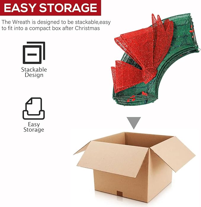 - UL Listed LED Lights: The 3D outdoor Christmas wreath with bow lights up the night with prelit 140 LED lights (100 Green Lights + 40 Red Lights). The lights are UL certified, safely designed to remain cool to the touch and powered by a 2-prong power plug.