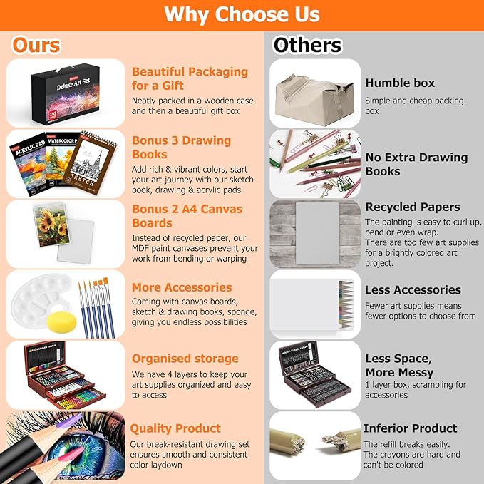 - 【Well Organized Deluxe Wooden Case】Our art kits with removable double drawers are neatly organized in a sturdy wooden case, providing convenient storage and easy access to your art stuff while keeping all drawing supplies tidy. Double wooden box makes it convenient for you to use on the go. Whether you're at home, in the office, at school, or travelling, your art supply kit is always within reach, making your artwork effortless. Great Christmas Gifts Stocking Stuffers Art Sets for Adults Kids.