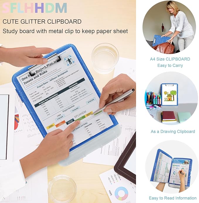 - Glitter Design: Clip boards 8.5x11 with storage have a bright color, Classic and chic glitter elements make this colorful clip boards more attractive. The ergonomic design of the grip is non-slip and comfortable. With this unique clipboard, your daily works are far more fun and easy