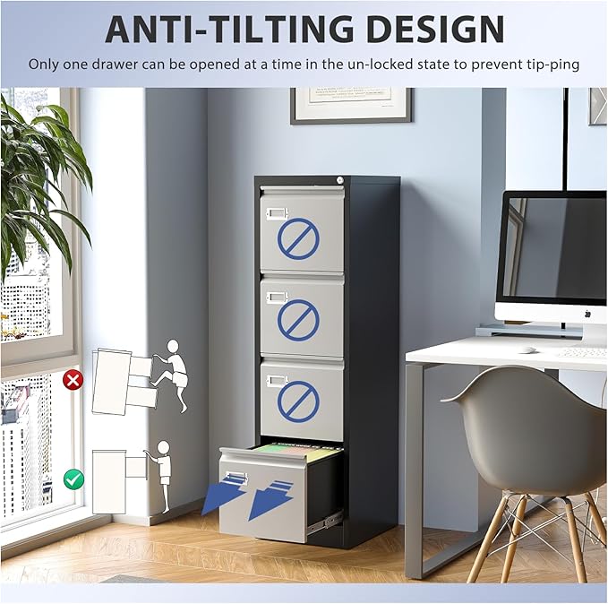 - 【Anti-Tilt Design】This office file cabinets has a lock that can lock all four drawers and comes with two keys. It helps you keep your valuables and documents safe. In the unlocked state, only one drawer can be pulled out at a time, preventing the movement of multiple drawers causing the overall center to shift and the box to fall.