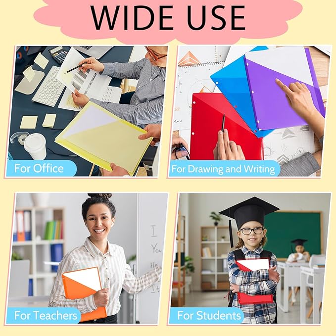 - Package Information: you will get 50 pieces of binder pockets, 5 colors, each color has 10 pieces, with size in approx. 9.25 x 11.22 inches/ 23.5 x 28.5 cm; Sufficient quantity will meet your using needs, and you can share them with your family