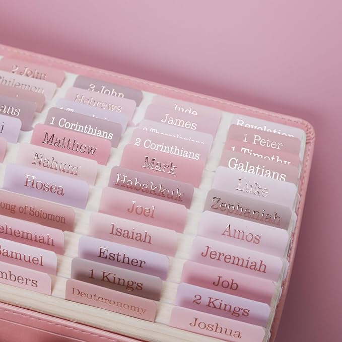 - Large Print, Easy to Read & Easy to Install: Silky velvet touch laminate,carefully designed pretty Bible accessories . The peel-and-stick Bible index tabs are self adhesive, simply align them with the provided guide or place them creatively.