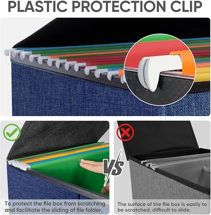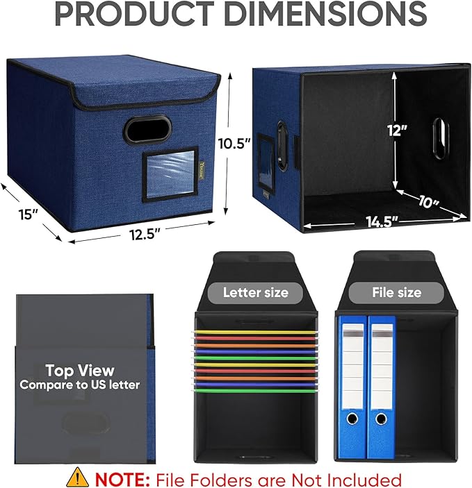 - [DURABLE MATERIAL] The outer layer of our filing box is crafted from high-quality polyester fabric and reinforced with thick cardboard in the middle. This construction ensures that the box maintains its shape and provides better bearing capacity for important documents and files. Its textured appearance can also serve as a stylish decorative element in any office or home.