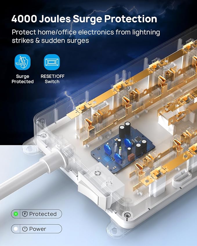 - 【Safety Certified】This power strip with usb ports is ETL certified and combines 4000J surge protection, overload protection, overcurrent protection, short circuit protection, and a 1382℉ fireproof shell to provide comprehensive safety protection for your tablet, TV, mobile phone, and other electronic devices against potentially damaging power disturbances