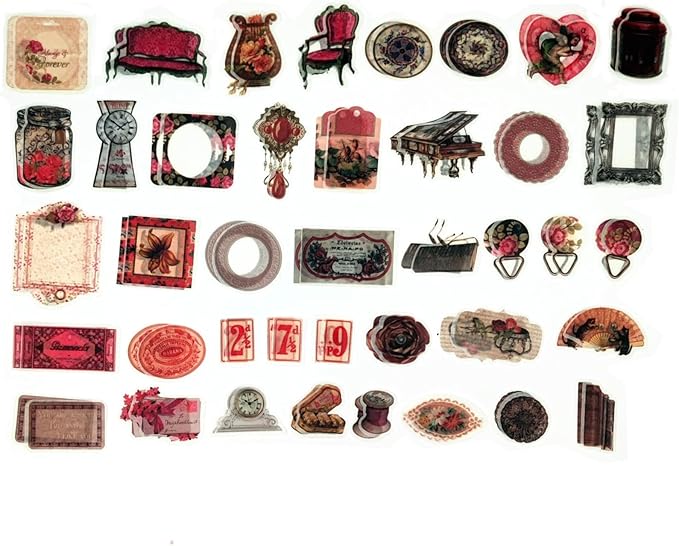 - Design: 80pcs washi stickers with 40 designs, 2 pieces of each; 120pcs vintage printing papers with 60 designs , 2 pieces of each.