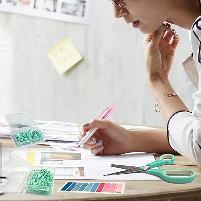 - 【Easy To Carry】 You can put these green desk accessories in the drawer or desk at will, it won't take up too much space. The clips are equipped with a lattice storage box for easy organization use and storage. You can also put this school supplies set in your handbag or schoolbag and take them anywhere.