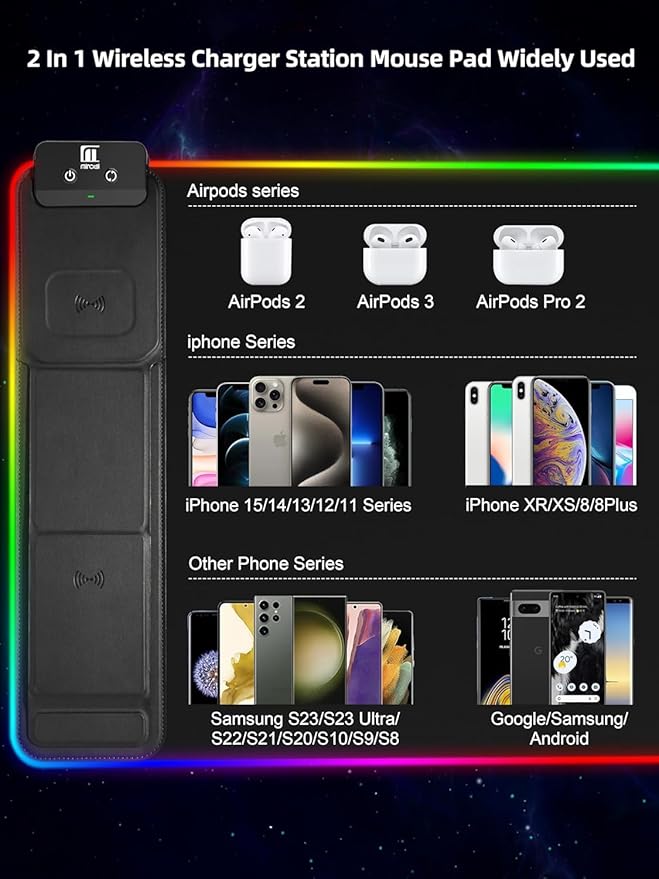 - 【Fast Charging Mouse Pad with Phone Holder】Gaming Mouse Pad has built-in 15W fast wireless charging function, which can conveniently charge your compatible devices without extra cables interfering with your desktop. Desk Mat compatible with iPhone 15/14/13/12/11/X/XR/XS/8 series; Samsung Galaxy S23/S22/S21/S20/S10/S9/S8/Note 9/8; Airpods 3rd/Airpods Pro 2nd/Airpods Pro and other Qi enabled devices. (Note: 15W need power adapter 9V 3A, and power adapter is not included with this Mousepad)
