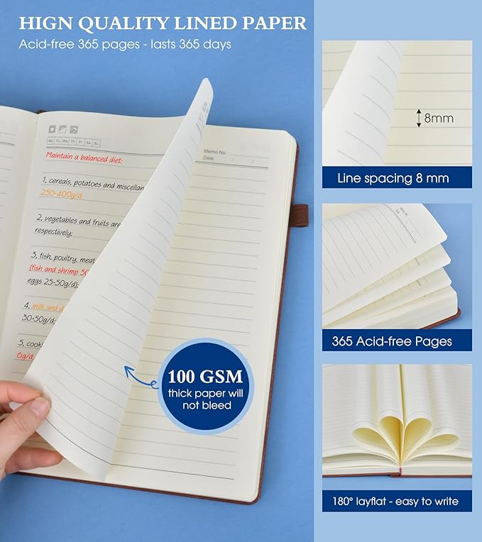 - 【365 Pages Premium Thick Paper】: Our PERCUN lined journal notebook is made of 365 pages high-quality 100Gsm thick ruled pager with an acid-free light Ivory paper that is thicker than normal. This premium quality paper will not cause bleeding, ghosting or smudging and is suitable for most types of pens,provides ample space for journaling, note-taking, and creative writing. The line spacing is 7mm, making it easy to write legibly and neatly.