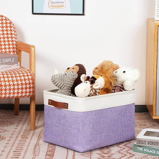 DULLEMELO Storage Baskets for Organizing, Shelves,Bedroom, Decorative Storage Bins with Leather Handles, Fabric Storage Basket for Office, Toys(3-Pack, White&Purple)