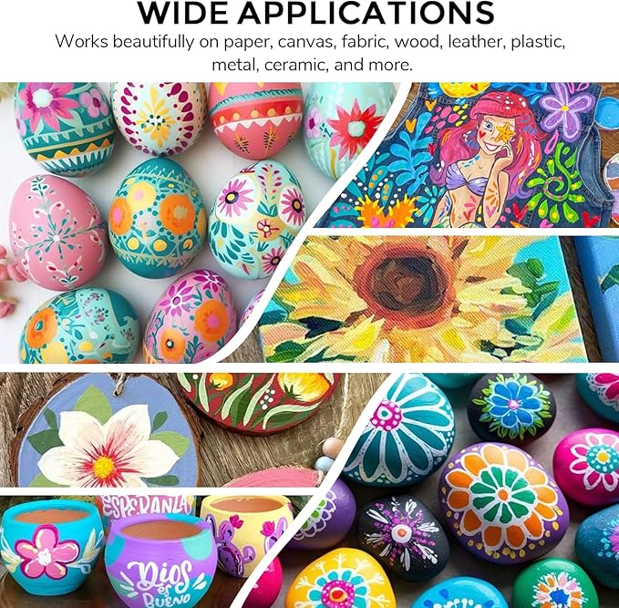 - VERSATILE USES: These acrylic paints dry quickly and adhere extremely well to surfaces. They are permanent, waterproof and will not fade and can be used indoors or outdoors, on walls, paper, glass, rocks, canvas, ceramics, fabric, plastic, metal or other materials. Suitable for everyone from beginner to intermediate or professional
