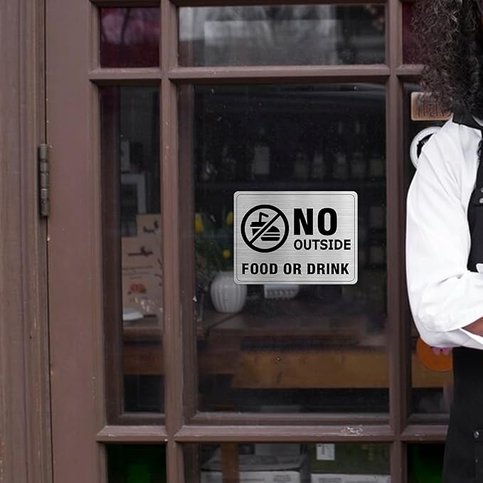 No Outside Food or Drink Sign Aluminum Silver 8 x 6 Inches Self-Adhesive Waterproof Metal Door Wall Sign for Business Restaurants 2 Pack