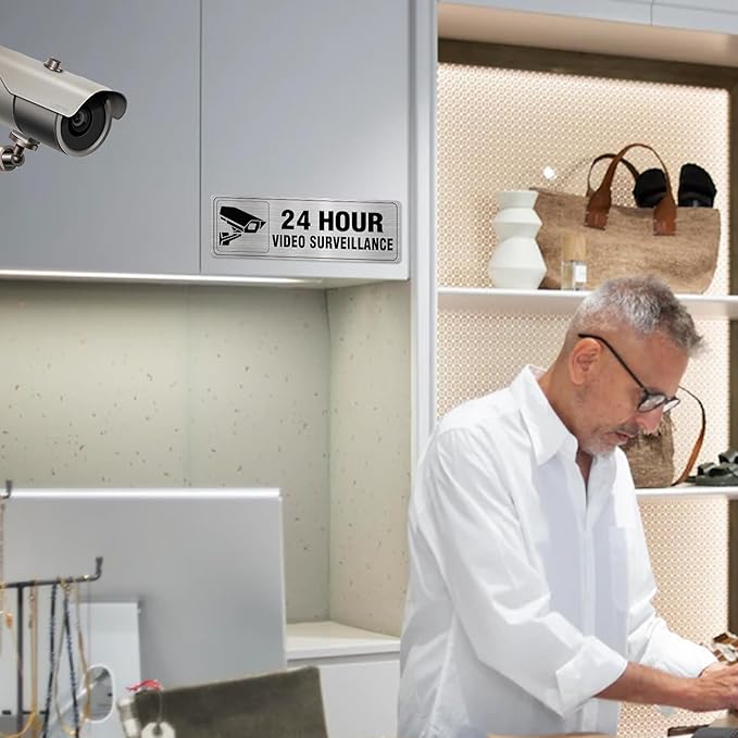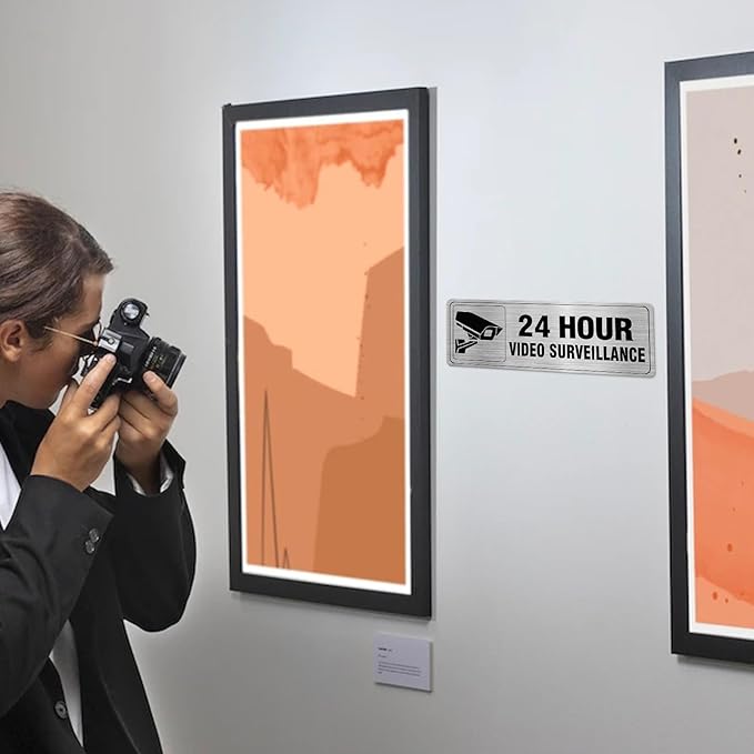 24 Hour Video Surveillance Sign Aluminum Silver 9 x 3 Inches Self-Adhesive Waterproof Metal Door Wall Sign for Business Restaurants 4 Pack