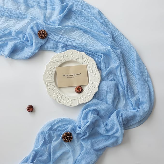 6pcs Light Blue Gauze Rustic Cheesecloth Table Runner 120 Inch 10 FT for Wedding Baby Shower Bridal Shower Birthday Engagement Garden Outdoor Party Long Sheer Boho Decorations