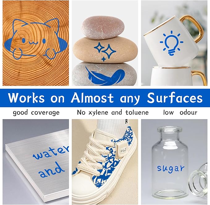 - Extensive Use: Paint pens mark steel and mark objects such as tires, bolts, metal pipes, bumper panels and more. Not just metal, Blue permanent markers can be used on rocks,wood, ceramic, canvas, tires, rubber, glass and plastic surfaces