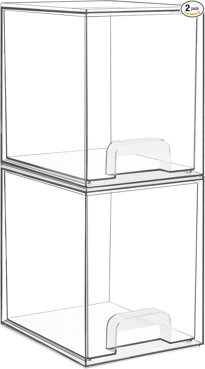- [Stackable Design] Come with 2 drawer storage organizers, each organizer measures 7.5"D x 6"W x 7.6"H. Vertical storage will save a lot of space. You can put other objects on top of acrylic bins to make your countertop and cabinet space more tidy. It can also be stacked with Vtopmart storage drawers of other sizes.