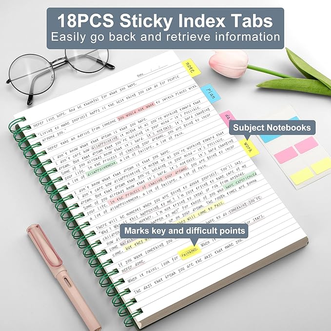 - 300 Pages Spiral Notebook: With 150 sheets/300 pages of classic 7mm college ruled paper, small size 5.7" x 8.22". Provide plenty of writing space for you. With 18 pcs divider sticky notes for better classify and make you more professional