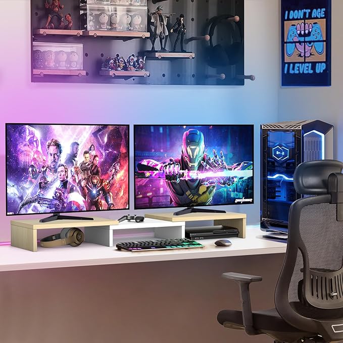 - Product Profile: The Monitor Riser for desk dimensions (33-48.2) x 9.3 x 3.7 inch (L*W*H), holds up to 44 lbs. Well made material, meticulous process and stable structure, the dual monitor stand for desk will perfectly satisfy your demand. The modern oak and white wood finish offer a clean and elegant look and create a stylish and warm home life.