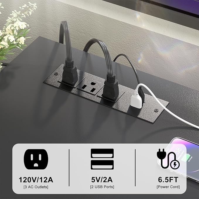 - Computer Desk with Built-in Socket & LED Lights: Built-in power charge station (3 regular outlets and 2 USB ports included), which allows keeping your laptop, printer or other everyday devices nearby while charged. You can also control the LED lights with the APP, and customize any color you like. Meanwhile, it has a variety of modes like music sync, timer functions, etc, providing a great ambiance for whatever mood you are in.