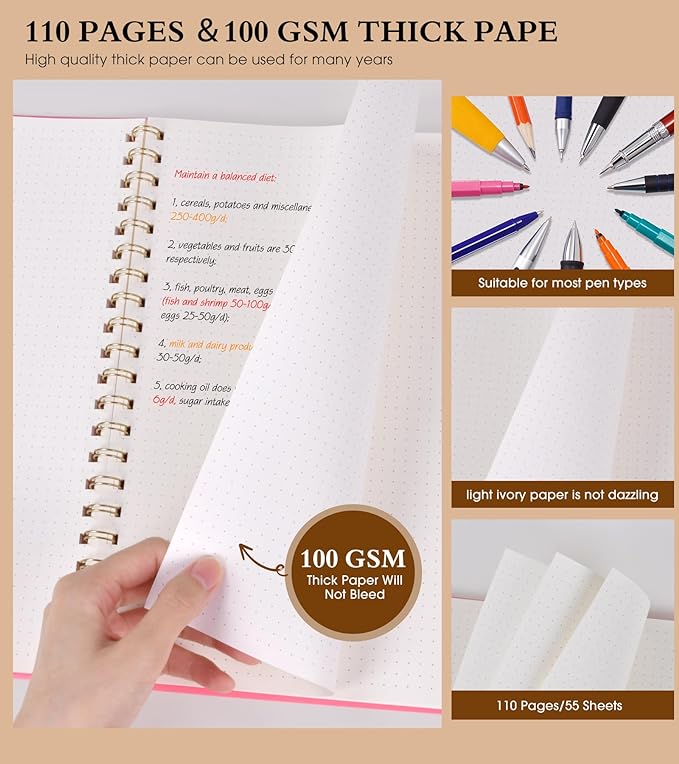 - 【100 GSM Ink-friendly Paper】 Our pink spiral dot grid notebook pages are very thick, which avoids ink bleeding through and ghosting. Suitable for most pen types, such as ballpoint pens, fountain pens. Each dotted journal 55 sheets/110 pages, offering enough space to write in. Allowing you to write on both sides of every page to maximize your usable space. light ivory paper is not dazzling, let you have a comfortable writing experience.