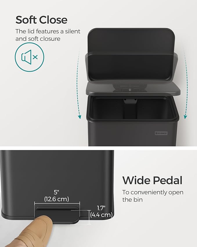 - [Soft Closure] The trash can features a slow, silent, and soft-close lid. No more dealing with loud clangs after use—enjoy a quieter and smoother disposal experience