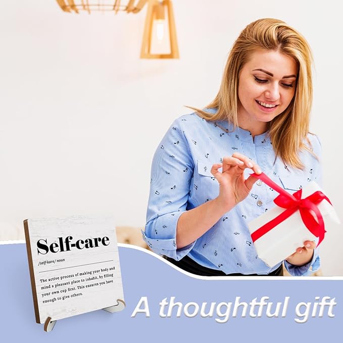 Self Care Definition Wood Sign Desk Decor Motivational Mental Health Rustic Office Cubicle Decor Inspirational Quotes Plaque with Wooden Stand Therapist Office Desk Accessories for Home Table Shelf