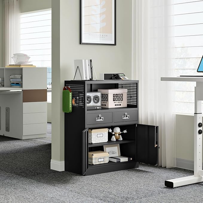 Yizosh Metal Storage Cabinet with 2 Drawers and Locking Doors,- 41.3" Steel Lockable Storage Cabinet with Shelves for Home Office,Garage,School (Black)