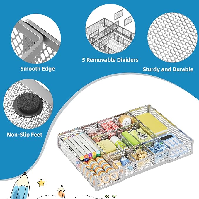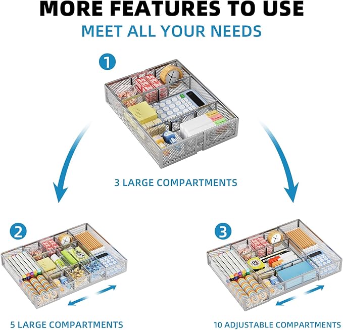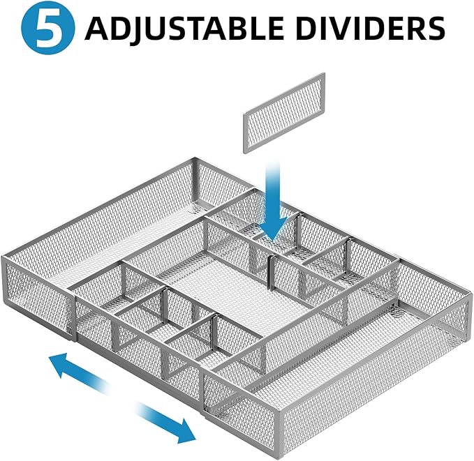 Marbrasse Expandable Desk Drawer Organizer, Mesh Tray with 10 Adjustable Compartments, Desk Organizers for Office Supplies, Makeup & Vanity (Expandable-Silver)