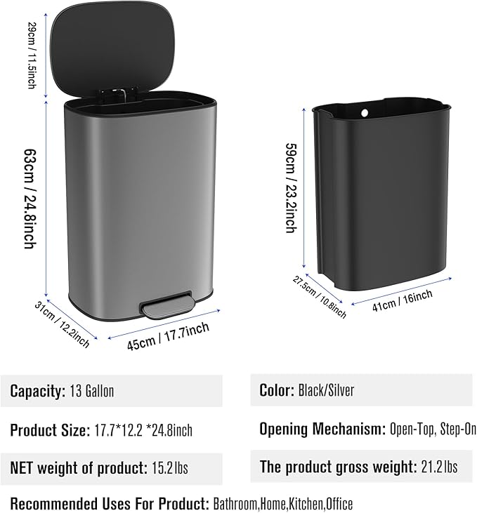- LARGE CAPACITY TRASH CAN: 12.2''LĂ17.7''WĂ24.8''H, 13.2 gallon(Please Note: Due to the curved angle edges of the box, manual measurements may have a slight error, and the actual size may be slightly larger). The huge capacity definitely meets your daily use, this can fits most brands of 13 gallon trash bags. It can be a good helper for your kitchen & make your room clean and tidy. The sophisticated oval appearance also makes it suitable for a variety of occasions.
