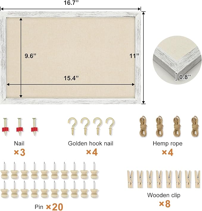 - Complete accessories: The 16x11 pin board comes with three triangular metal hooks, allowing you to hang the frame horizontally or vertically on shelves and walls. 20 wooden pins, 8 wooden clips, 4 gold hook nails, 3 screws, and 4 hemp ropes, providing you with a range of personalized decoration combinations.