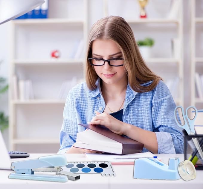 - Quality Materials, The blue stapler and blue tape dispenser are mainly made of quality plastic and metal, the blue office supplies looks elegant and noble, very suitable for desktop office supplies, and as a stylish gift for friends or colleagues.