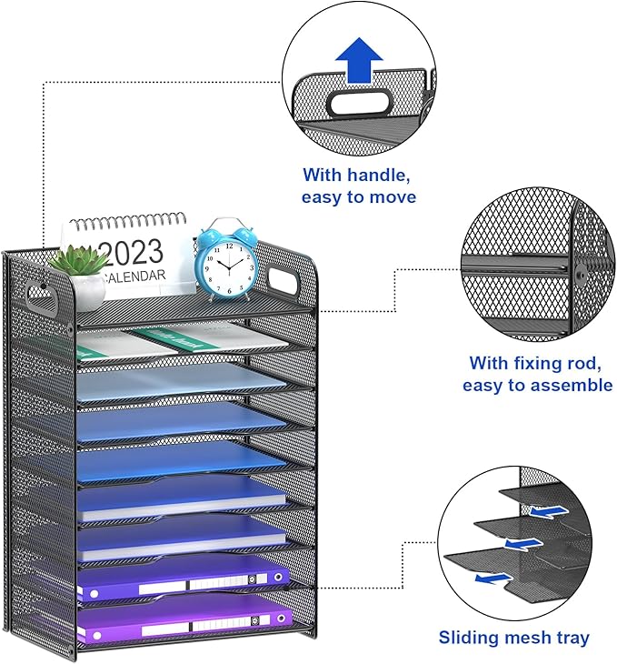 - 【9-Tiered Letter Tray】 : 9 Tier sliding trays are perfect for storage all your A4/letter sized papers and file folders,the width is 9.4 inch, which allows you can place the papers both vertically and horizontally.