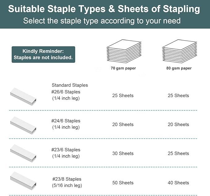- Easy to Use & Quick Reloading: Easy to use as a one finger touch stapling stapler on the desktop or a handheld stapler on the go! The release button makes refilling a breeze: Push the button and the magazine will pop out for fast reloading, which saves efforts and boosts efficiency in a fast-paced office. Suitable staple types: staples with 1/4" long leg for 20-25 sheets: #23/6, #24/6, #26/6(standard staples) and staples with 5/16" long leg for 40-50 sheets: #23/8 (Staples not included)