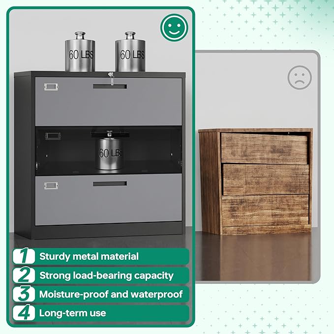 - 〖Durable Metal Material〗File cabinet is made of 0.8mm thick steel,whole is solid and does not deform, and it is stronger than wooden filing cabinets in terms of firmness, durability, moisture resistance, and fire protection.
