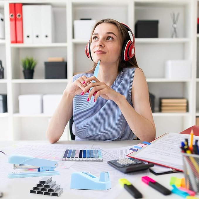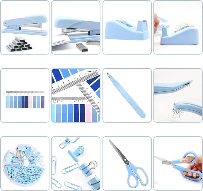 - 【Package Includes】 This blue office supplies contains 1x blue Stapler, 1x blue Magnetic Staple Remover, 1000x Staples, 1x blue Tape Dispenser, 1x Office Scissor, 4x Bulldog Clips 4x Small Clips 2x Hollow clip 2x Big Clips 70x Paper Clips and 10 colors Tabs with ruler.